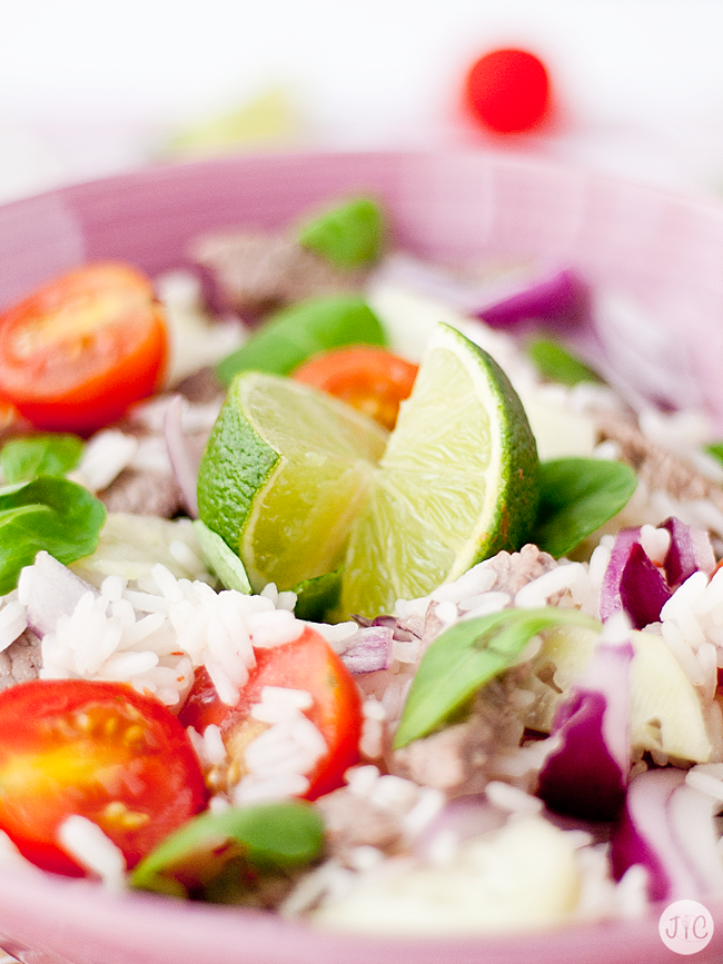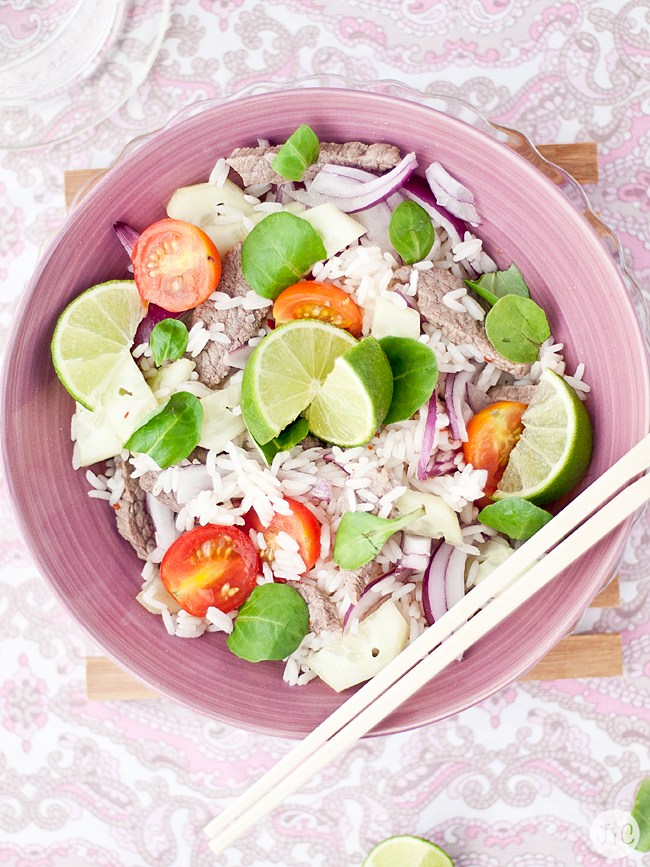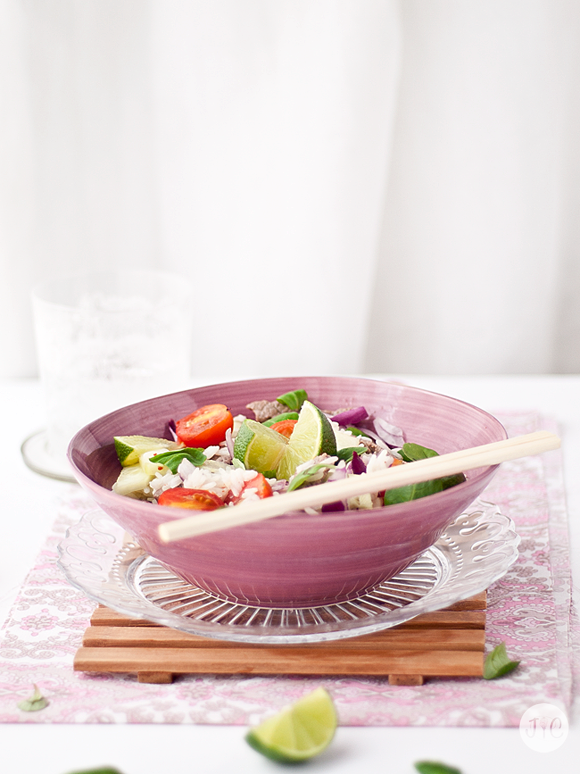 Pero no es una ensalada cualquiera. Es una ensalada con un toque Thai. Se trata de una deliciosa ensalada de arroz con un aderezo que a mí me encantó, con un toque picante. Supongo que sabéis que debemos añadir dos o tres comidas con picante a la semana para "motivar" a nuestro metabolismo. Esta puede ser una buena manera, ¿no os parece?