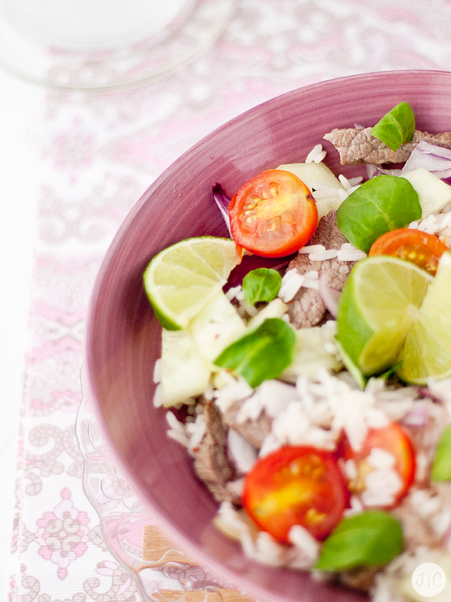 - En un bol mezclamos el arroz, la cebolla roja partida en juliana, el pepino cortado en rodajas, los tomates partidos por la mitad, las espinacas y la ternera.