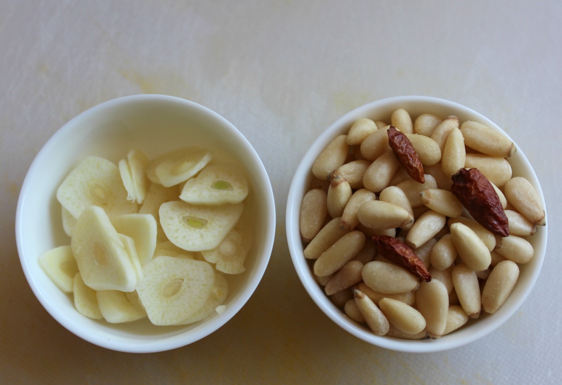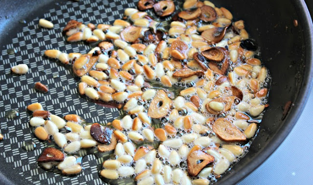 Ponemos en una sartén el aceite, los piñones y los ajos fileteados.