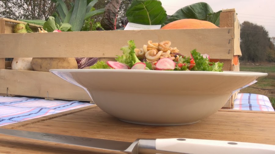 En un plato hondo colocamos el lollo verde en un lado y al otro lado la escarola. Damos volumen. Poner unos granos de granada por encima. Poner un poco de vinagreta y colocar unas láminas de rabanito. Colocar el calamar caliente encima de la ensalada.