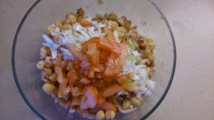 Disponemos los garbanzos y los chipis en un bol, junto al tomate y la cebolla.
