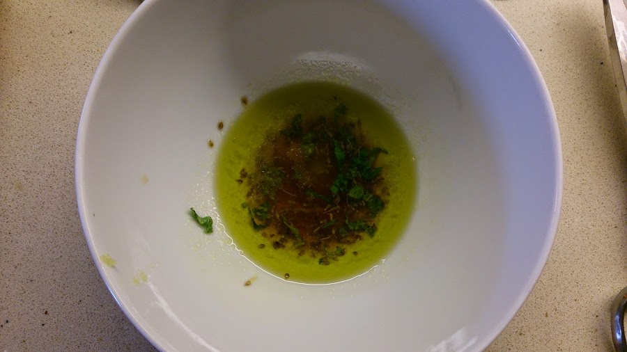 Para la vinagreta, ponemos en un recipiente el aceite, el vinagre, la menta cortada fina (sólo las hojas), la sal y el comino. Con unas varillas, emulsionamos hasta que nos quede una salsa homogénea.