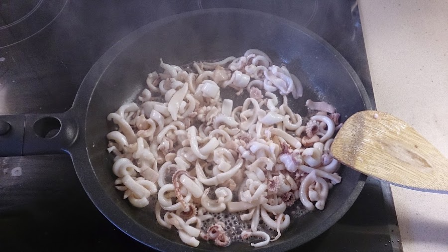 En una sartén, con dos cucharadas de aceite 0.4º, freímos los chipironnes que hemos cortado.