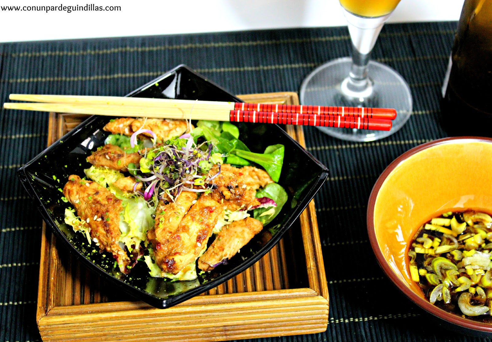 Pues como básicamente me he limitado a reproducir fielmente la receta asaltada (este mes he sido bueno) casi que os dejo con el texto original. La única diferencia ha sido que en el momento de cocinar el pollo no he añadido aceite, simplemente con el wok o sartén muy caliente, si colocas el pollo con el adobo no necesitas aceite.