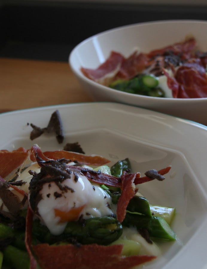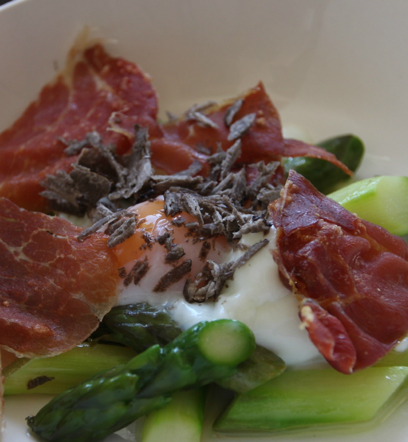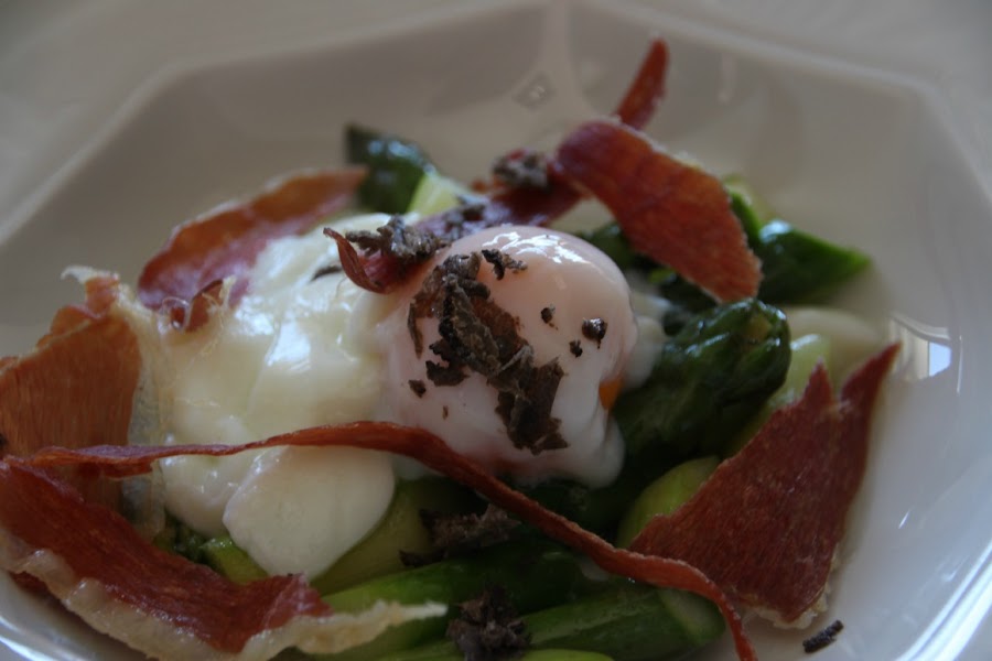 Troceamos los espárragos y los aliñamos en un bol, con aceite de oliva, sal en escamas y un poquito de aceite aromatizado de trufa. Removemos y colocamos en el fondo de los platos, unos trozos de espárragos.