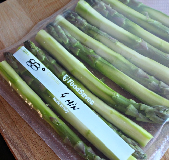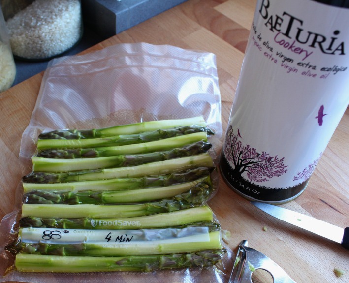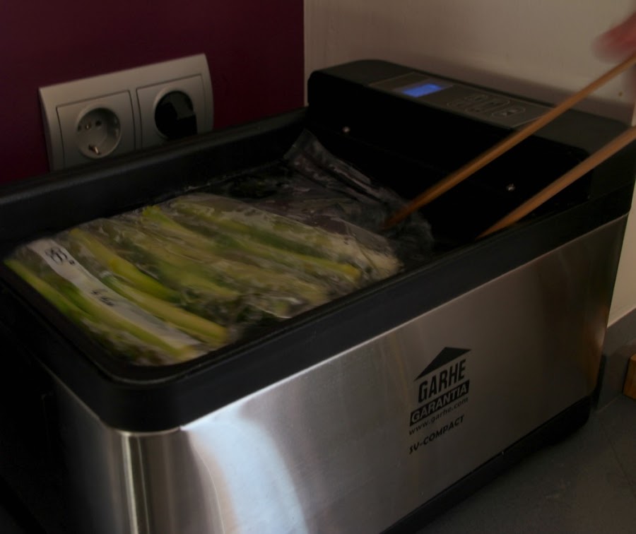 Subimos la temperatura a 88º ( thermomix a 90º, 3-4 min), introducimos la bolsa de espárragos al vacío, y esperamos, 4 min.