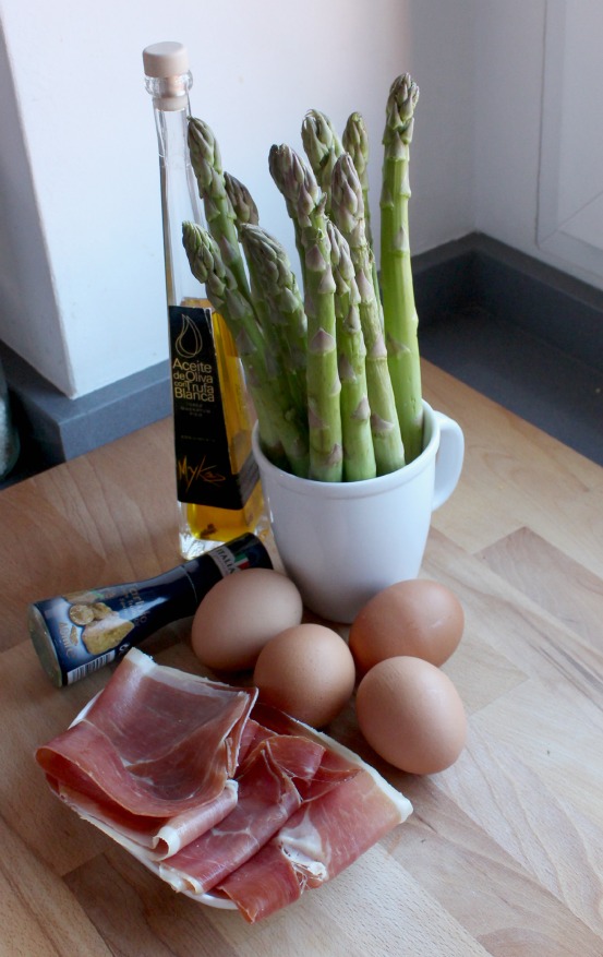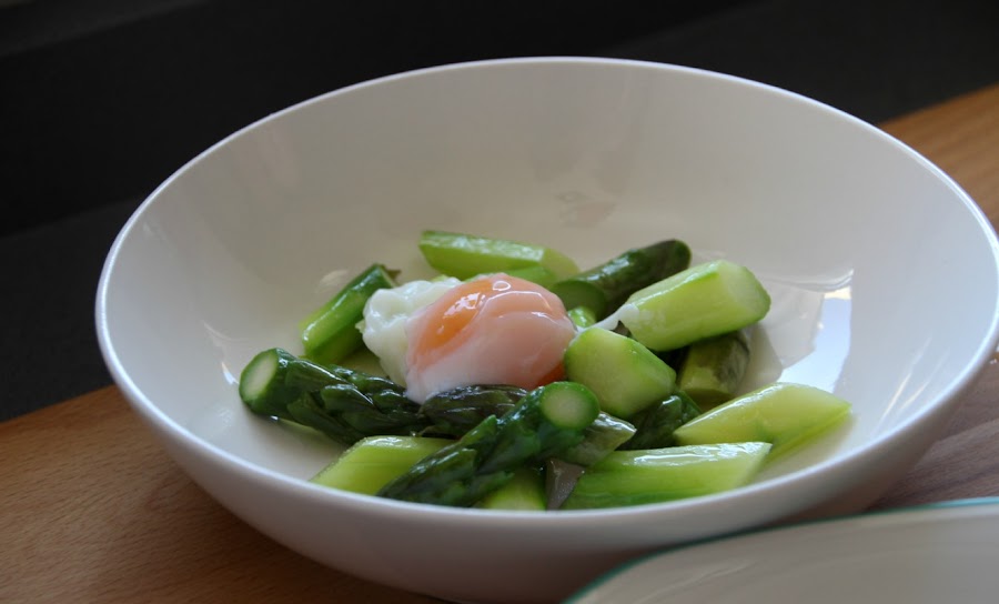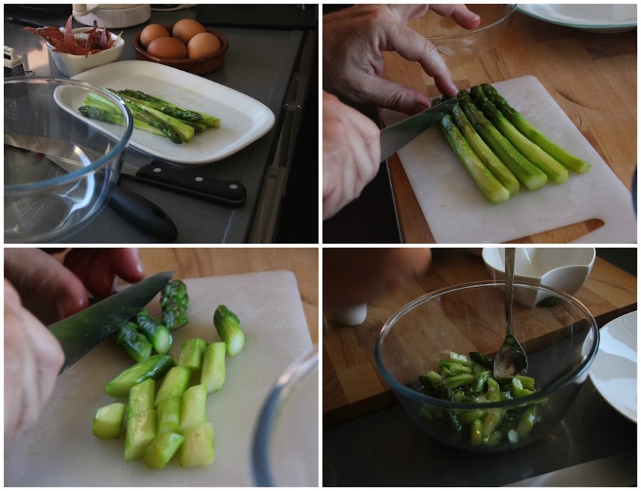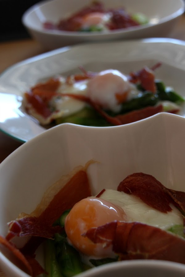 Cascamos el huevo y con cuidado de no romperlo, lo colocamos sobre los espárragos.