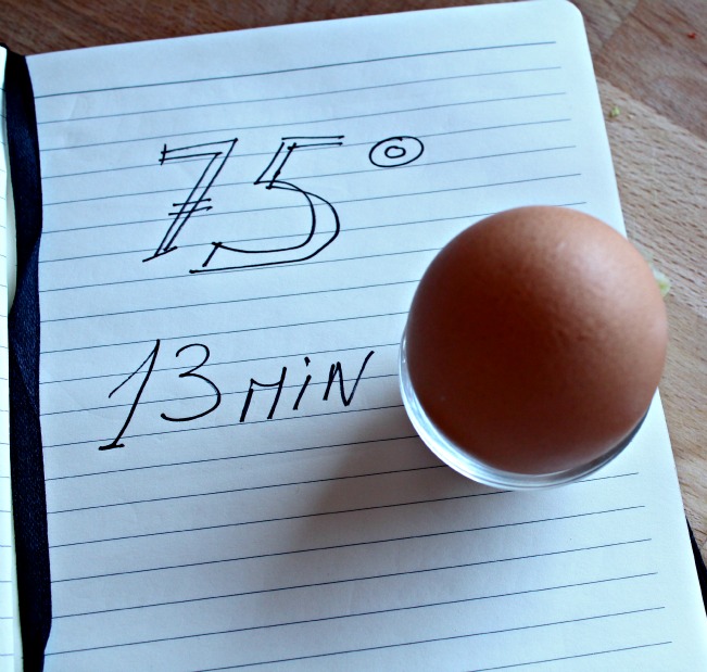 Si el agua ha llegado a los 75º, ponemos los huevos dentro de una bolsa (de las de congelar, no hace falta ponerlos al vacío) y los sumergimos, durante 13 min.
