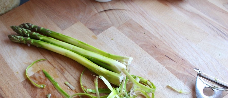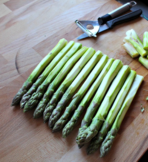 Pelamos los espárragos. Con un pelador, desde un poco más abajo de la yema, hasta el pie del tallo.