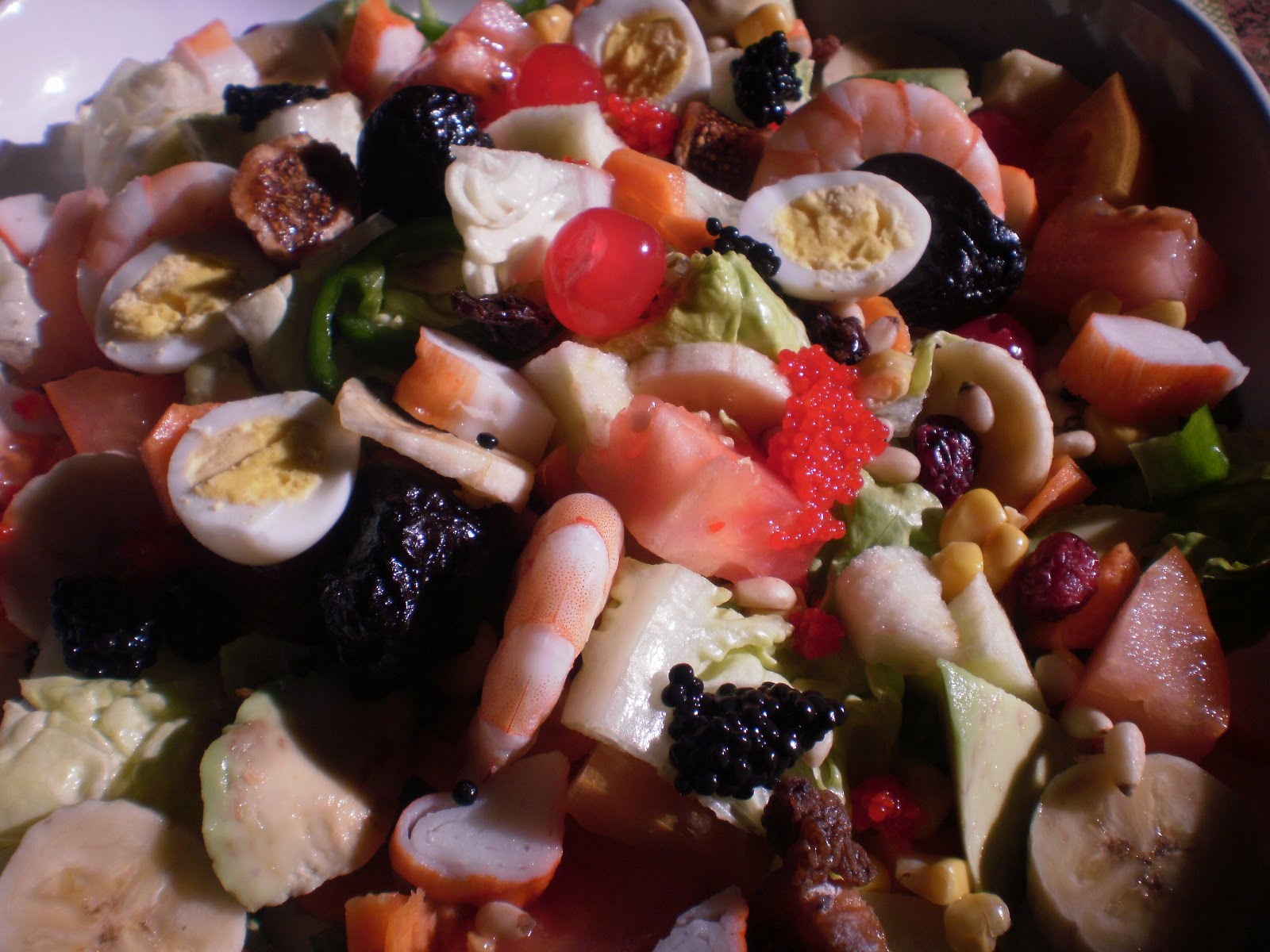 Lechuga (malagueña a ser posible), tomate, huevo de codorniz, atún, pimiento verde, anchoas, mango, aguacate, pasas, piñones, dátiles, ciruelas pasas, langostinos, manzana, plátano, piña, aceitunas, surimi (palitos de cangrejo), higos secos, maiz, huevas de sálmon rojas, sucedáneo de caviar, puntas de espárragos blancos, palmito, nueces y lo que imaginen.
