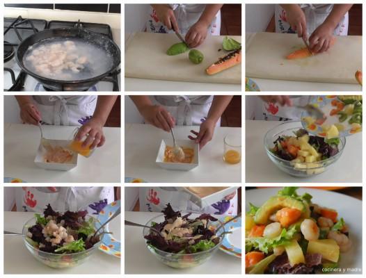 Si no vais a servir la ensalada tropical al momento os aconsejo que no le echéis la salsa dejarla aparte y aliñarla con ella justo en el momento de servir.