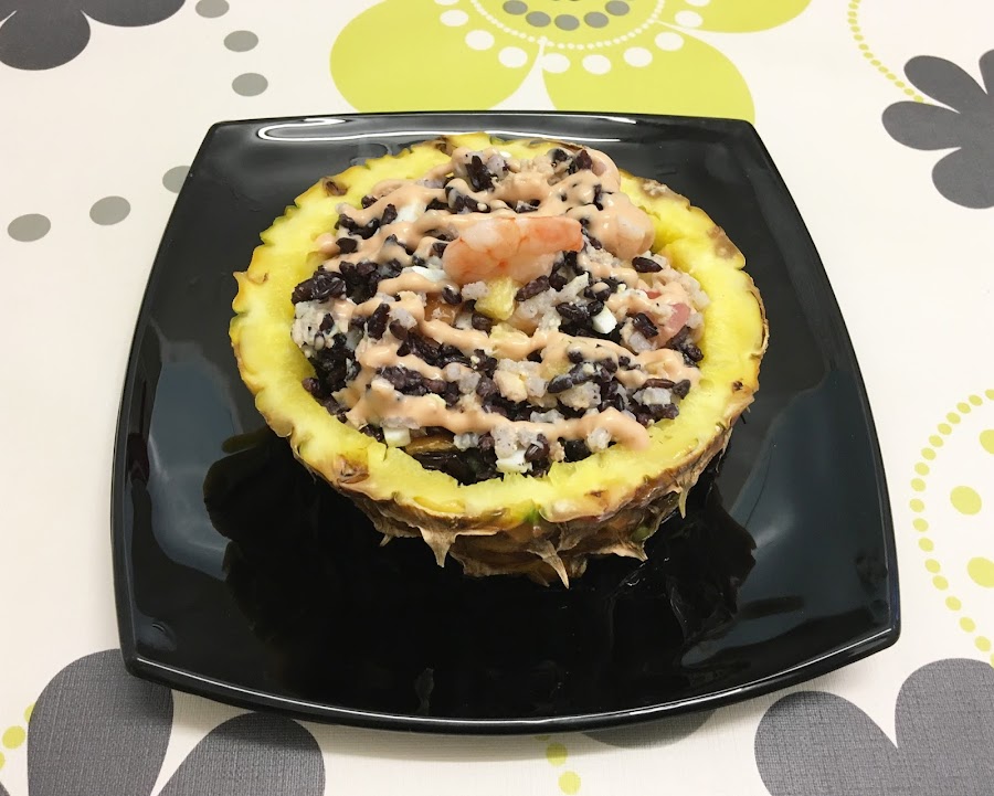 - En un bol, mezcla los dos tipos de arroz con el atún, el huevo, la piña, las gambas y el tomate.
