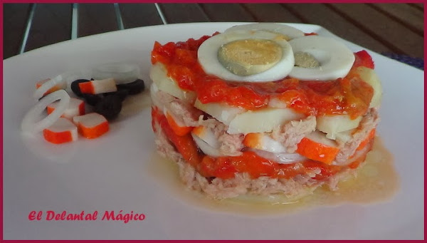 Para emplatar ponemos una cama de rodajas de patata, atún desmigado y unos aros de aceituna. A continuación, ponemos pimientos asados (los había hecho dos días antes así que los aproveché, pero podeis utilizar de los que venden en bote), cebolla y trocitos de palitos de mar. Volvemos a empezar, patata, atún, aceitunas, pimientos y terminamos con el huevo y un poquito de aceite.