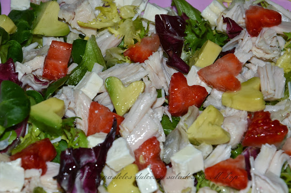 Cortamos las fresas en rodajas y con un cortador pequeño en forma de corazón, hacemos corazones y añadimos a la ensalada