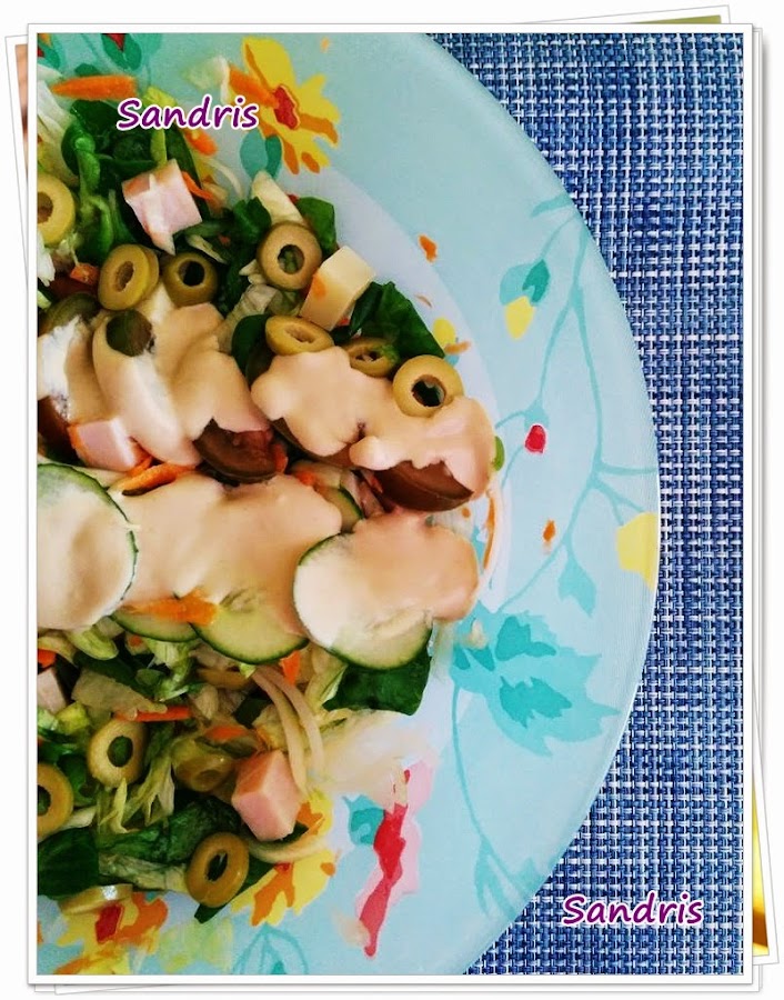 Esta vez me apetecía un montón de ingredientes, a veces nos apetecen recetas con pocos ingredientes y esta vez me apetecía una ensalada con bastantes ingredientes para darle un toque diferente. Me gusta mucho también variar el corte de los ingredientes, a veces en cubos, a veces en tiras, más grandes, más pequeños... Me gusta mucho variar y aunque siempre uso más o menos los mismos ingredientes, se nota la variación. En tema de salsitas, lo más habitual mío en ensaladas es aceite de oliva, sal y vinagre o limón pero a veces me apetece darle un toque especial y me invento una salsa. Lo que más uso es la mostaza dijon y a partir de ahí vario con vinagre de módena, limón, mayonesa, ketchup normal o picante, pimienta negra, perejil, orégano... depende del momento, de los ingredientes o de lo que apetezca en cada ocasión.