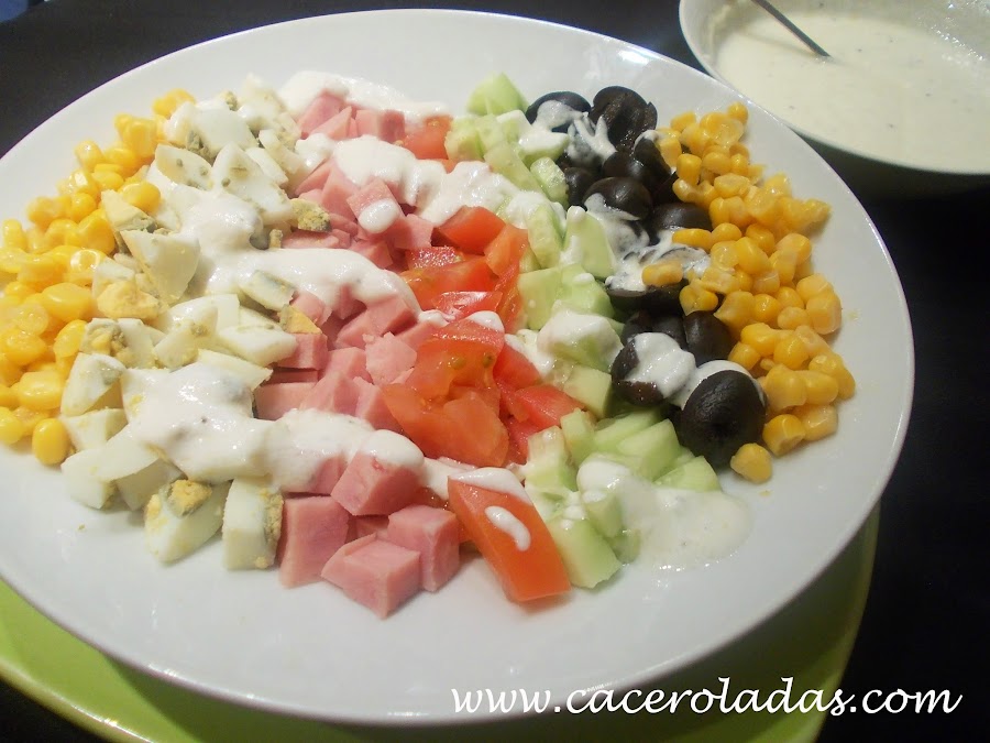Sacamos del frigo nuestra salsa de queso y aliñamos con ella nuestra colorida y sabrosa ensalada....