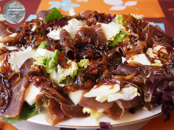 En una fuente. Mientras ponemos una sartén con la mantequilla, echamos la cebolla y el azúcar, dejamos que se vaya caramelizando poco a poco, dejamos enfriar y lo repartimos por encima de la ensalada, el queso se puede poner rallado, yo no lo pongo porque hay alguno que no le gusta, y así puede apartarlo , pero queda mucho mejor a la vista. A la hora de comer la aliñamos yo huso vinagre de Módena pero eso es al gusto de cada uno