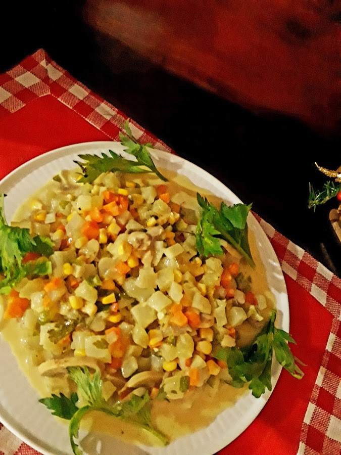 En un tazón mezcle papas,zanahoria,vainicas,hongos,maíz,perejil,cebolla,chile rojo,apio,aparte en otro tazón mezcle mayonesa,mostaza,azúcar,aceitunas y el ají peruano picado revolver bien,colocar la mezcla de mayonesa a la mezcla de papa revolver bien,ojalá refrigerar 1hora mínimo antes de servir.