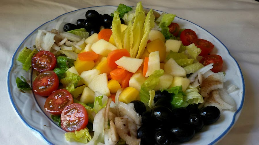 Estamos ya entrando en el verano y, nada mejor, que una buena ensalada para refrescar cualquier comida. He optado por una ensalada vegana, para que todos aquellos que siguen este tipo de dieta alimentaria, encuentre su rinconcito en este blog. Esta ensalada lleva hortalizas como la lechuga, la zanahoria, la cebolla y el tomate muy habituales en nuestras casas, y frutas como la manzana y el melocotón, también muy de cada día ¿Donde está la gracias si lo tenemos todo más que saboreado? Pues la gracia reside en las dos vinagretas que la aderezan y en una colorida y cuidada combinación de sabores, colores y texturas preparada sin necesidad de salir corriendo a comprar productos gourmet para su elaboración.