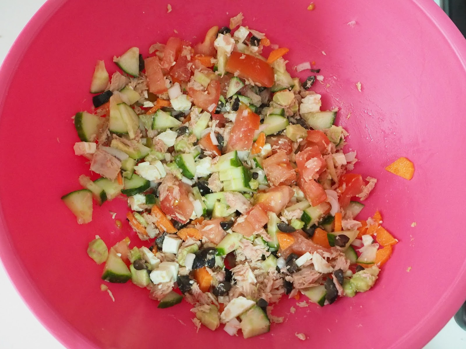 - En un bol vamos añadiendo el resto de ingredientes, cortados en cuadraditos pequeños.