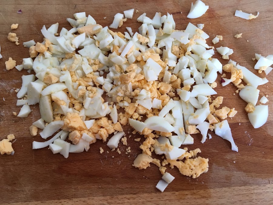 Cuando han pasado 8 minutos de los huevos hierviendo los sacamos del agua, los pasamos por agua fría, les quitamos la cáscara y los picamos.