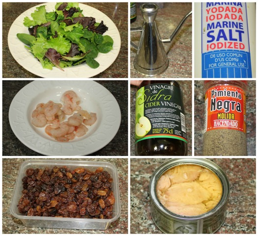 En una fuente ponemos, las mezcla de lechugas, añadimos el atún desmenuzado, ponemos las pasas al gusto, añadimos las gambas y aliñamos con sal, pimienta, aceite y vinagre.