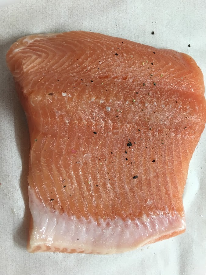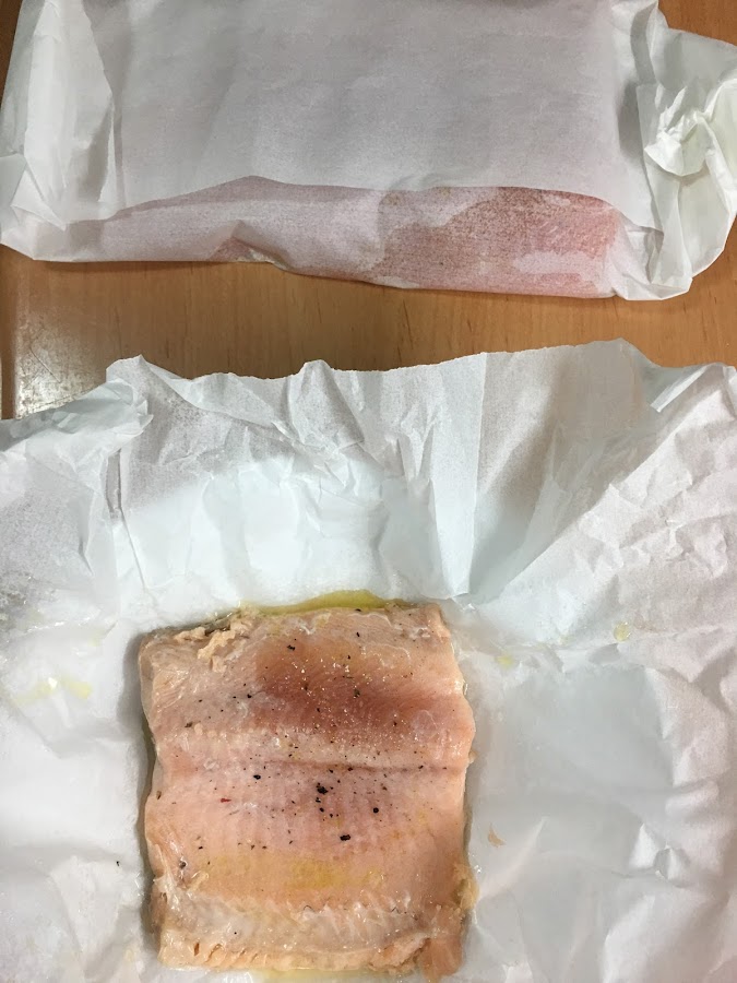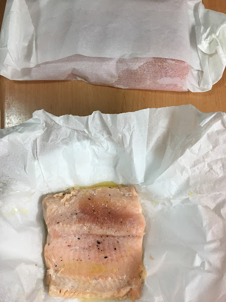 Se prepara la trucha, disponiendo cada trozo (yo pedí al pescadero que me quitara la piel y me partiera el filete de trucha en dos) en un papel de hornear, con sal y pimienta y un hilo de aceite: