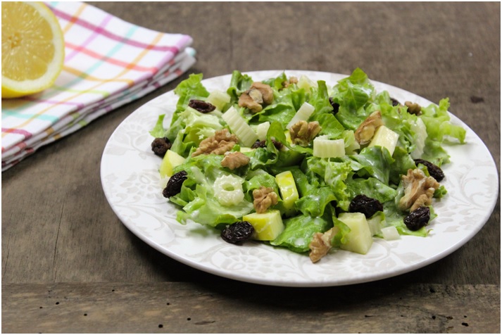 4. En una ensaladera mezclamos la lechuga, las manzanas, el apio, las nueces y las pasas. Salpimentamos al gusto y aliñamos con mayonesa, os recomiendo que no pongáis demasiada para evitar que enmascare el sabor de los demás ingredientes.