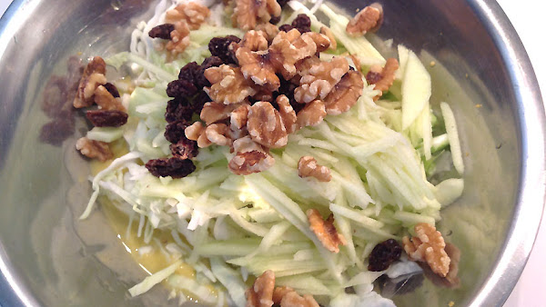 Añade unas pasas (si es posible sin semillas) y las nueces peladas y troceadas. Las cantidades debes ponerlas a tu gusto.