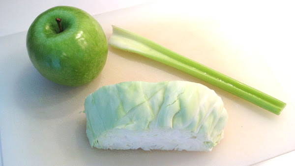 Corta la manzana en trozos, retira el corazón (las semillas) y la piel. Corta en láminas y estas láminas en tiras finas. De un tamaño aproximado al de la col y el apio.