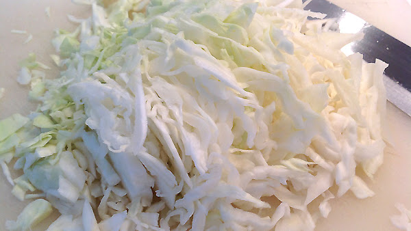 Retira las hojas externas y el tronco de la col. Pica en juliana fina.