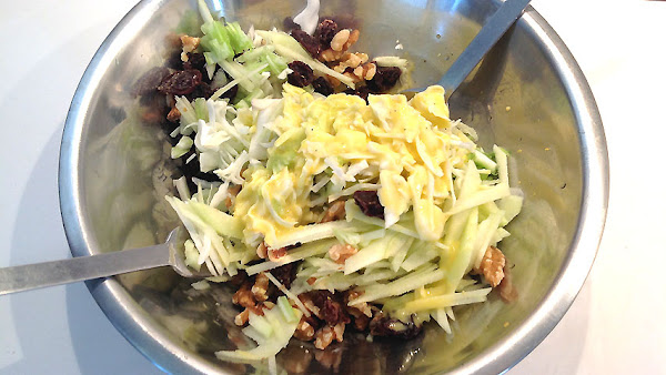 La manzana, pelada y sin semillas la corto en láminas y estas en tiras similares a las de col y apio.