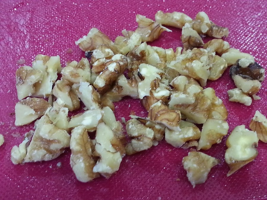 3. - Troceamos las nueces, a mi me gustan en trozos pequeñitos, pero podéis dejar los trozos a vuestro gusto. Reservando alguna mitad para decorar.