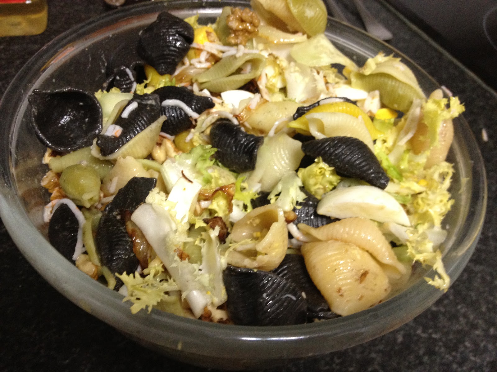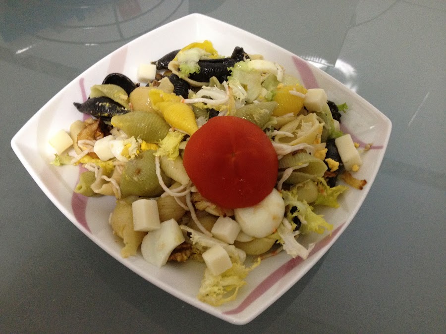 2º - Cocemos la pasta en una olla con agua y sal , una vez quede " al dente " , retiramos del fuego , escurrimos y la introducimos en un bol junto con los huevos duros troceados a nuestro gusto .