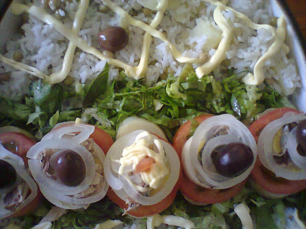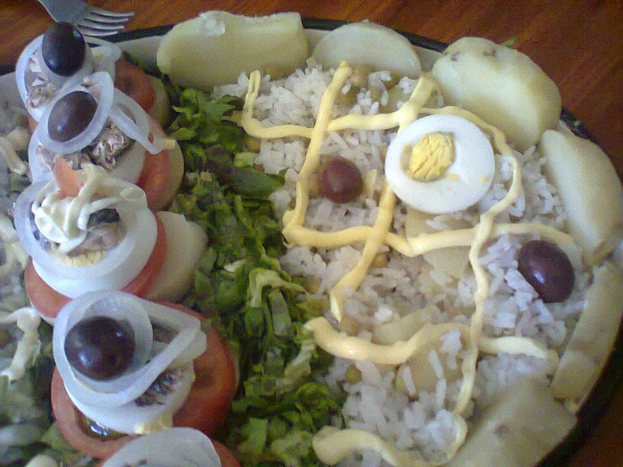 Y elaboré una ensalada muy particular por su simpleza, a algunos de mis hijos y nietos les encanta, arroz con papas.....solo que yo la llamé ARROZ CON PAPAS A LA CHEF!!!.....por que ahora mis hijos me "cargan" (hacen bromas) con esto del blog: ahora tenemos a mamá chef en casa!!...y yo lo disfruto, no me la creo...se quien soy...pero me divierto, y lo disfruto!!!...Espero lo hagan y disfruten de una ensalada completa como es esta.