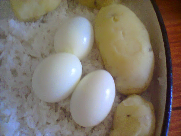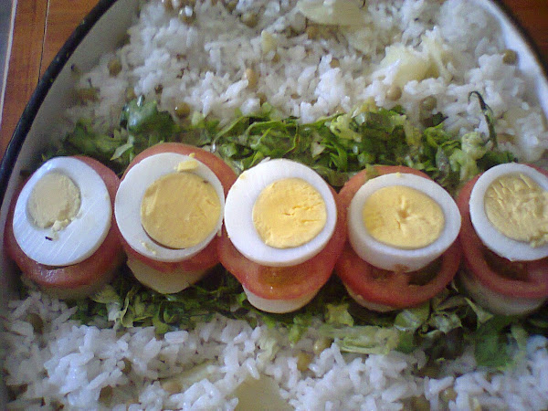 Se realiza muy fácil...hervimos, arroz y lo colamos para que enfríe y no se siga cocinando, también las papas con su cascara (las pelamos cuando estén frías) y los huevos.