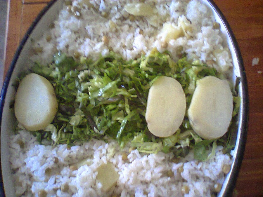 Preparamos el arroz con aceite, agregamos 2 huevos picados, las arvejas y 2 papas cortadas en cuadrados y mezclamos muy suavemente.