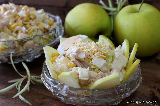 Una ensaladilla , como la rusa , pero mucho más sana, sustituimos la patata por manzana y queda riquísima!! No te la pierdas, la ves en mi blog Julia y sus recetas.