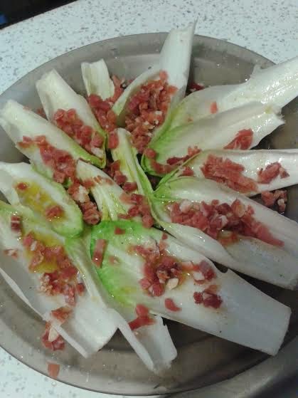 Separar las hojas de las endivias, lavadlas en agua fría, ponerlas en un plato y echar un poco de sal y los taquitos de jamón, (procurad no echar muchos para que que no tengan muchas calorías).