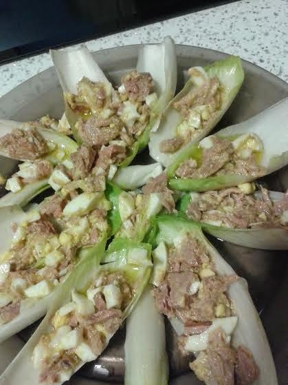 En la foto de abajo podéis ver otra ensalada de endivias, pero esta la hice con una latita pequeña de atún al natural y un huevo cocido y la vinagreta con dos cucharadas de aceite y zumo de limón.
