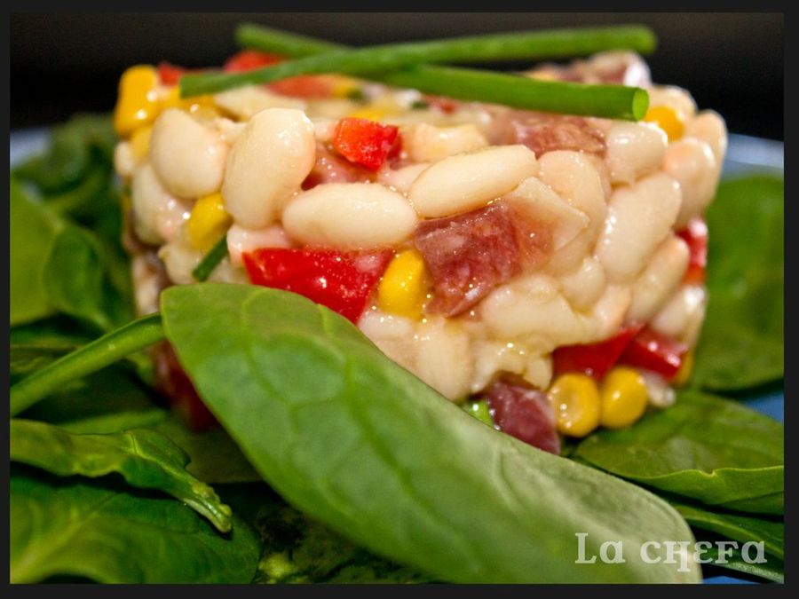 Esta ensalada que nos proponen desde el blog LaChefa, es un plato muy completo en el que no sólo tenemos las alubias, sino que además, se sirven sobre espinacas frescas, lo que enriquece mucho nutricionalmente la receta, y se mezcla con maíz, pimiento, cebollino, jamón cocido en taquitos, aceite de olivas, vinagre y sal.