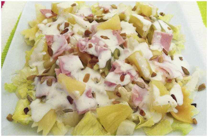 Ensalada de pasta con salsa roquefort y pipas