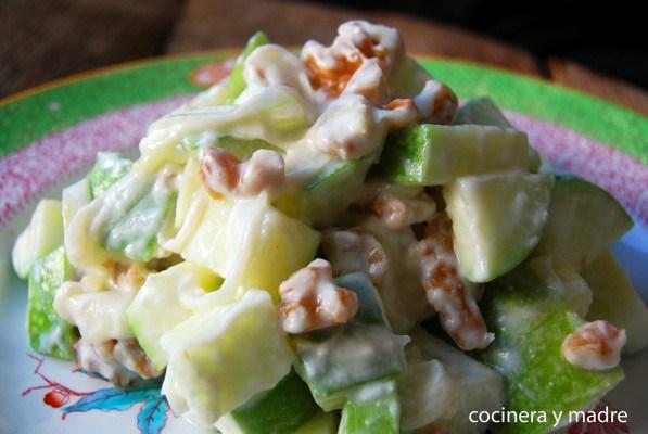 Seguro que habréis oído alguna vez el nombre de este plato, la ensalada Waldorf, es una receta internacional y muy sencilla de una ensalada muy aromática. Es perfecta como entrante si la acompañáis de unas hojas de lechuga verde o una muy buena guarnición para platos de pescados y carnes. Os va aportar frescor al plato y si no le añadís mahonesa será muy ligera y perfecta para la dieta. Si no os gusta el apio podéis sustituirlo por repollo fresco y os quedará igual de buena.