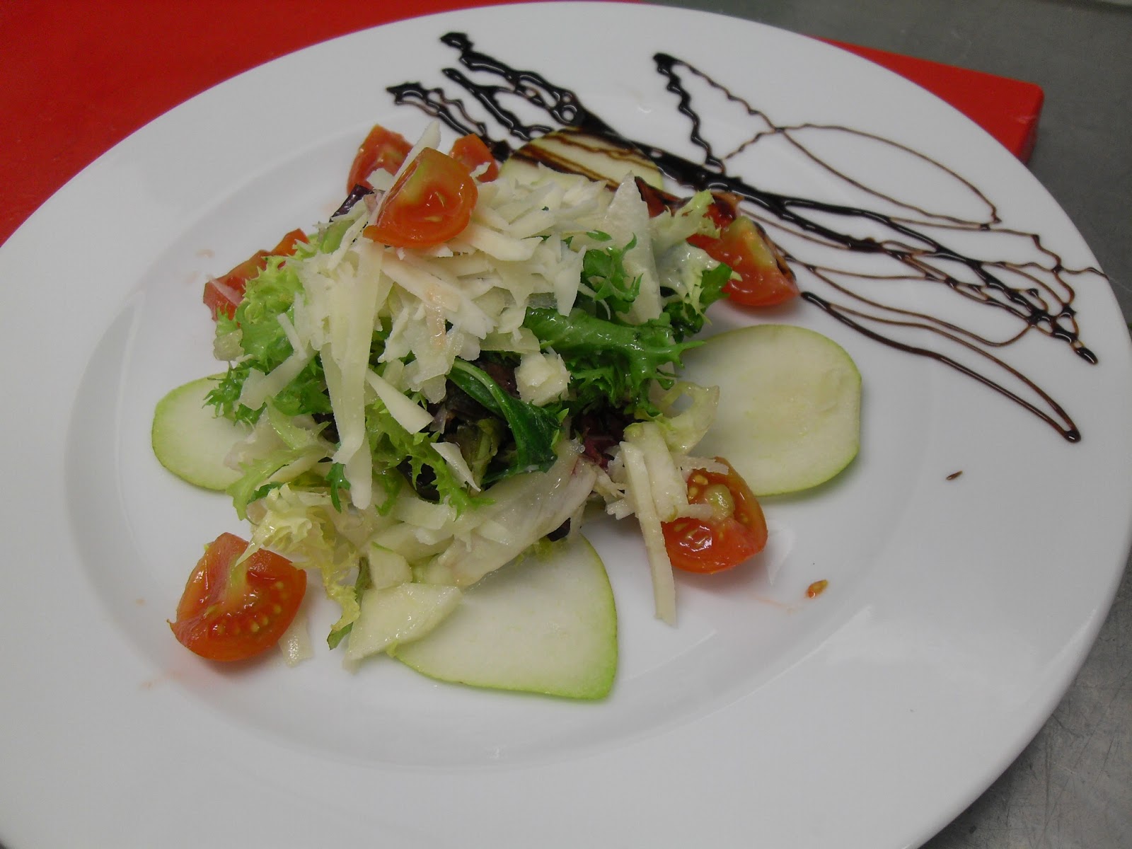 Rúcula, escarola, lechuga hojas de roble, tiras finas de calabacín, tomates cherrys, pasas, nueces, almendras tostadas picada, queso gorgonzola.