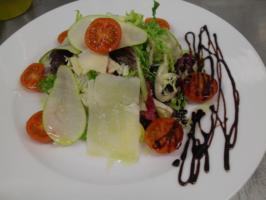 Ensalada mezclum, tomates cherrys, Tiras de hinojo, pera a tiras y a láminas para adornar, láminas de queso pecorino.