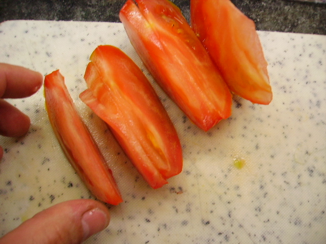 10.- Cortamos el tomate y vamos rodeando la ensalada con las rodajas.