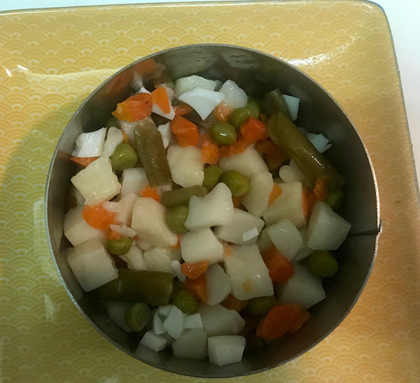 Ahora la presentación, pela los huevos y reserva la yema, pica la clara y ponla en un bol con las verduras.