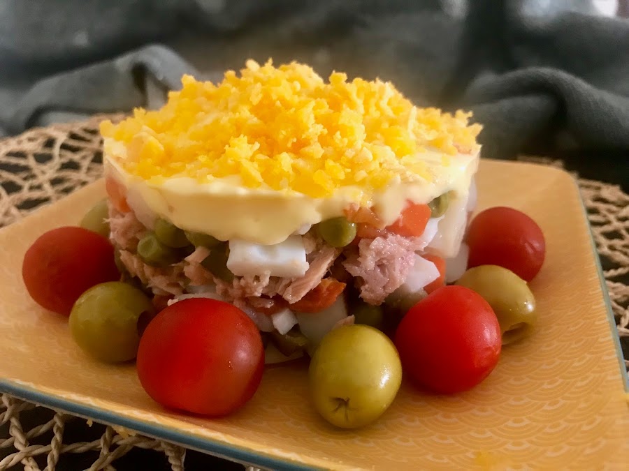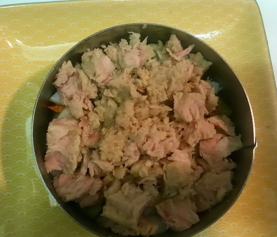 luego el atún y cubre con mas verduras,
