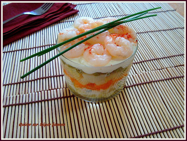 Rellenar el vasito con una primera capa de patatas, que debe ser la más grande. A continuación una de zanahorias. Los espárragos bien cortaditos, los tiernos guisantes, una abundante capa de mayonesa que hay que extender bien para que penetre entre las hortalizas. Encima distribuir las gambas que ya estarán bien escurridas. Dejar enfriar en la nevera, pero retirar de ella diez minutos antes de servir para que los vasitos se vean traslucidos y más presentables.