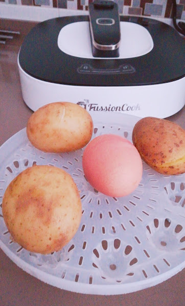 Ponemos dos medidas de agua en la cubeta de la FC7 Smart. Colocar la bandeja de vapor dentro y sobre ella poner las patatas (bien limpias con la piel y que sean del mismo tamaño) y el huevo (podemos poner zanahoria también y pelada), tapar la olla y seleccionar menú VERDURAS, 15 Min.